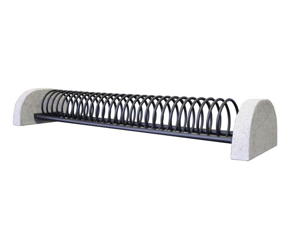 Il portabici è costituito da un elemento a spirale fatto con tubo Ø22 mm saldato a due tubolari orizzontali tondi in acciaio Ø48 mm. Alle estremità dei tubolari orizzontali sono saldate le doppie staffe in piatto 50x5 opportunamente forate per il fissaggio ai muretti laterali di sostegno in calcestruzzo sabbiato dim.752x135xh.420 mm (predisposti con boccole filettate M12) tramite viti TE M12x25 inox mascherate sotto coperchio metallico. La rastrelliera può essere zincata e verniciata a polveri poliestere termoindurenti nelle diverse colorazioni RAL oppure in acciaio inox. Può essere da 3, 5, 7 e 9 posti, ed inoltre con accostamenti in serie può fare composizione a batteria. È adatto a luoghi dove non si può fissare al pavimento tramite tasselli. Per scuole, oratori, stazioni, ecc. Molto robusto è in grado di sopportare senza problemi le intemperie.