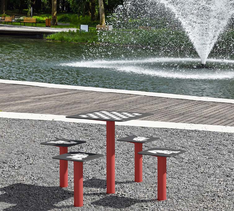Tavolo da 2 a 4 sedute indipendenti per il gioco degli scacchi. La base del tavolo e delle sedute è composta da un tubo tondo in acciaio 80x2 mm saldato ad una piastra base quadrata in lamiera di acciaio sp. 7 mm e ad un telaio in acciaio sp. 3 mm su cui sono fissate i piani seduta quadrati e il piano da gioco quadrato in HPL sp. 8 mm. Quest’ultimo è serigrafato per identificare l’area di gioco. Tutte le parti metalliche sono zincate e verniciate a polvere poliestere termoindurente. Tutta la viteria è in acciaio inox AISI304. Fissaggio a terra con cementazione o predisposto con fori Ø 12 mm per tasselli meccanici (non inclusi).