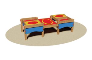 Certificato in conformità delle Norme Europee EN 1176 dall’Istituto Tedesco TÜV - SÜD. Realizzato in legno di pino nordico impregnato in autoclave con sali atossici. La struttura è costituita da otto montanti di sez. cm 7x7 e sponde perimetrali di sez. cm 11,5x2,5. All’interno ci sono tre vaschette sagomate realizzate con vari strati di resina ad alta densità colorata e da due vani per contenere la sabbia; sono previsti tre coprivaschette realizzati con pannelli decorativi in bilaminato stratificato HPL dai colori vivaci. Assemblaggio mediante bulloneria in acciaio zincato 8.8 e dadi autobloccanti. Elementi copridado a norma in nylon colorato.